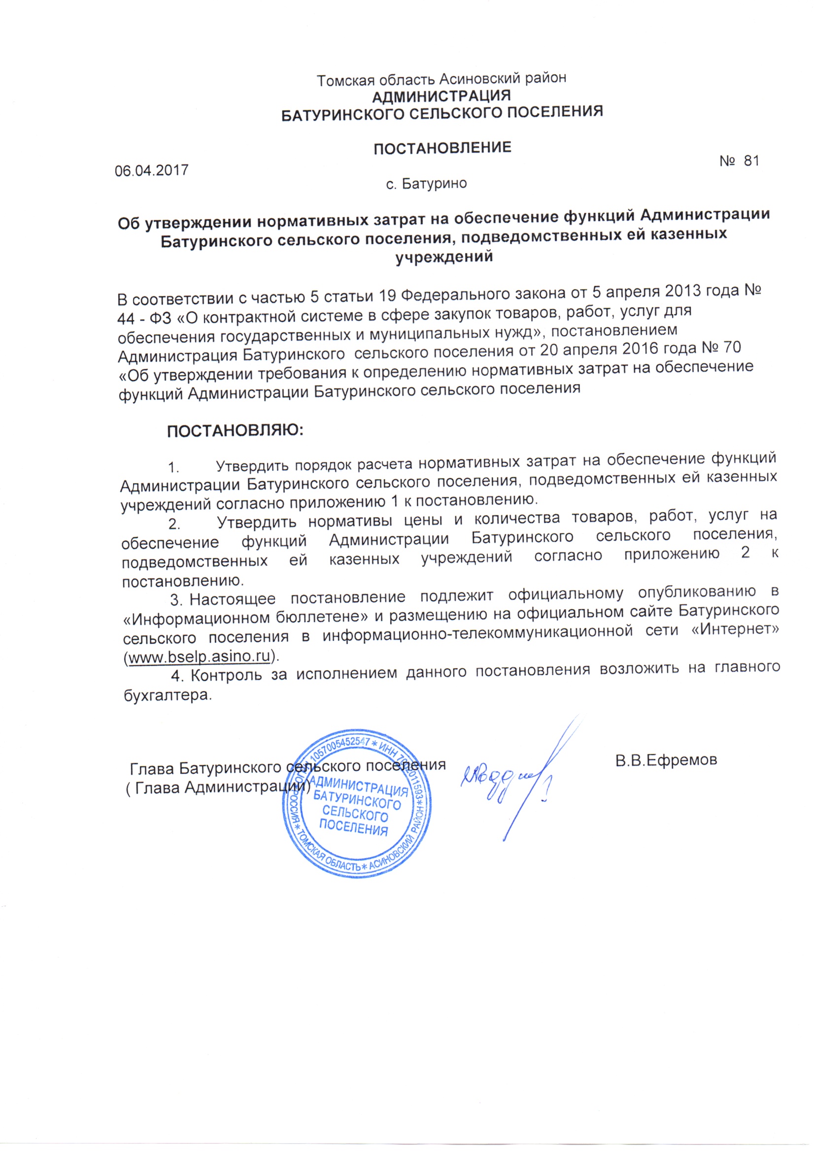 Об утверждении нормативных затрат на обеспечение функций Администрации Батуринского сельского поселения, подведомственных ей казенных учреждений (Дата опубликования 06.04.2017 г.)